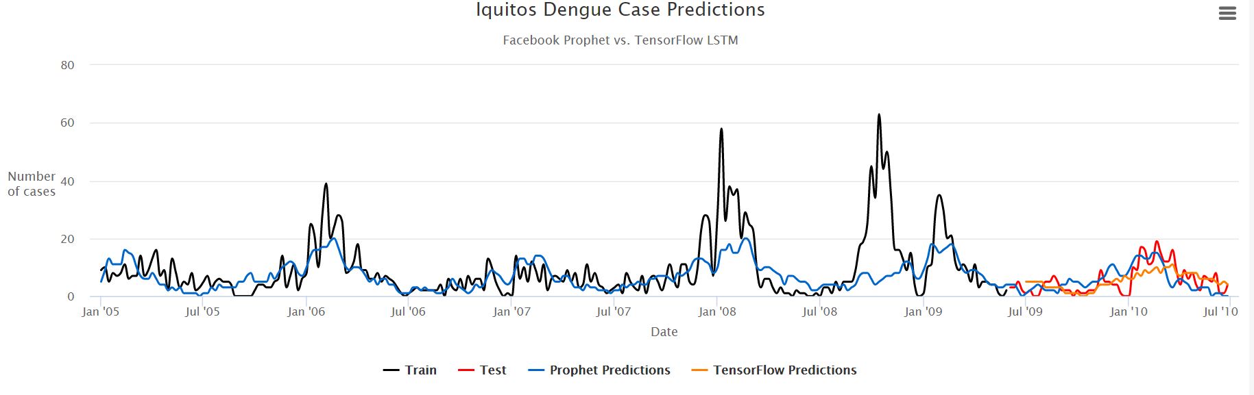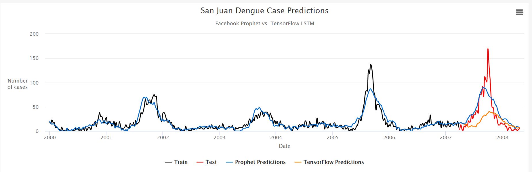 Our goal was to predict the number of dengue cases each week in each location based on environmental variables describing changes in temperature, precipitation, and vegetation. Predictions were generated based on a dataset with weekly cases from 1991 to 2007 for San Juan and 2001 to 2009 for Iquitos. Two prediction models were used. Facebook Prophet forecasts time series data based on an additive model where non-linear trends are fit with yearly, weekly, and daily seasonality, plus holiday effects. TensorFlow is a Deep Learning library developed by Google, we developed a simple Long Short-Term Memory(LSTM) model.
